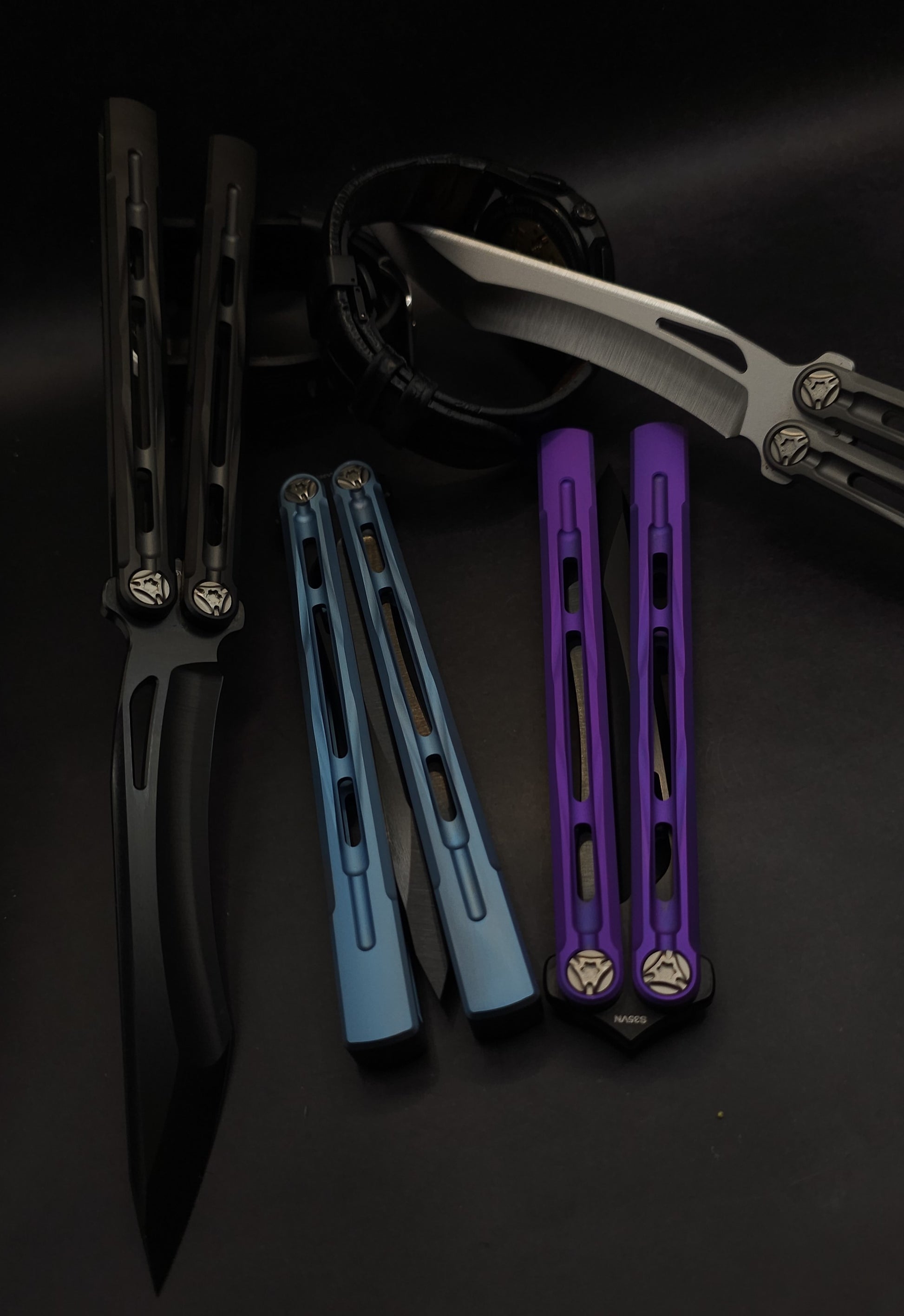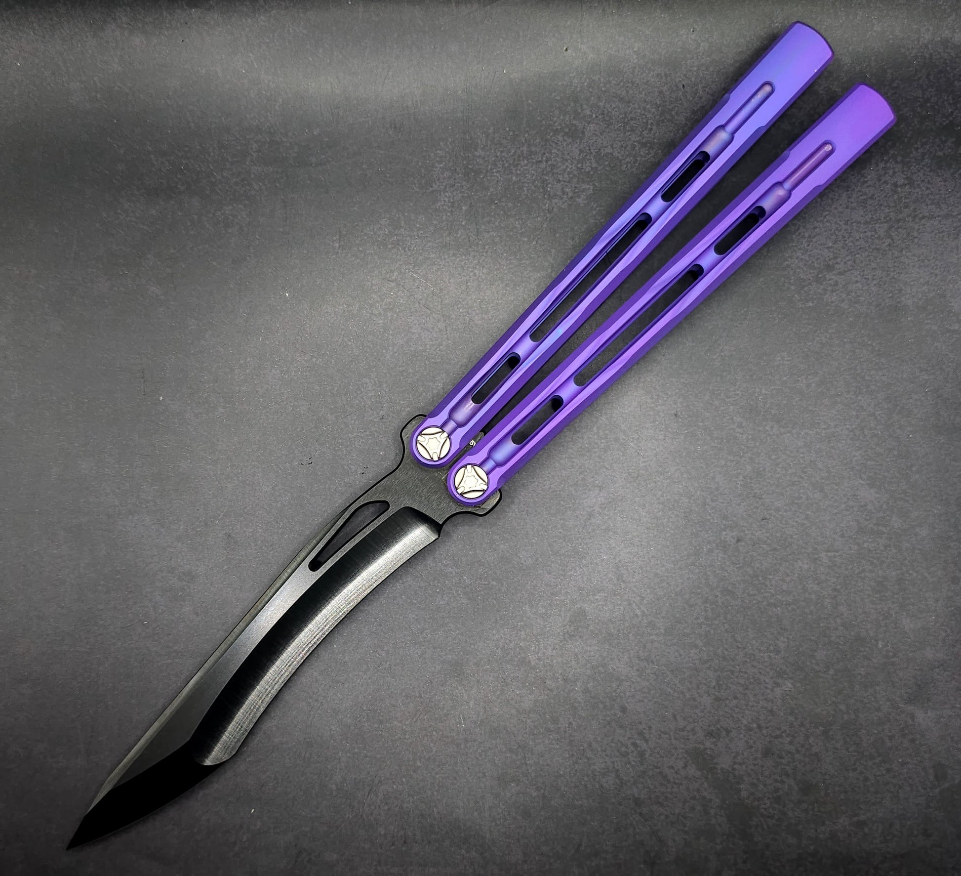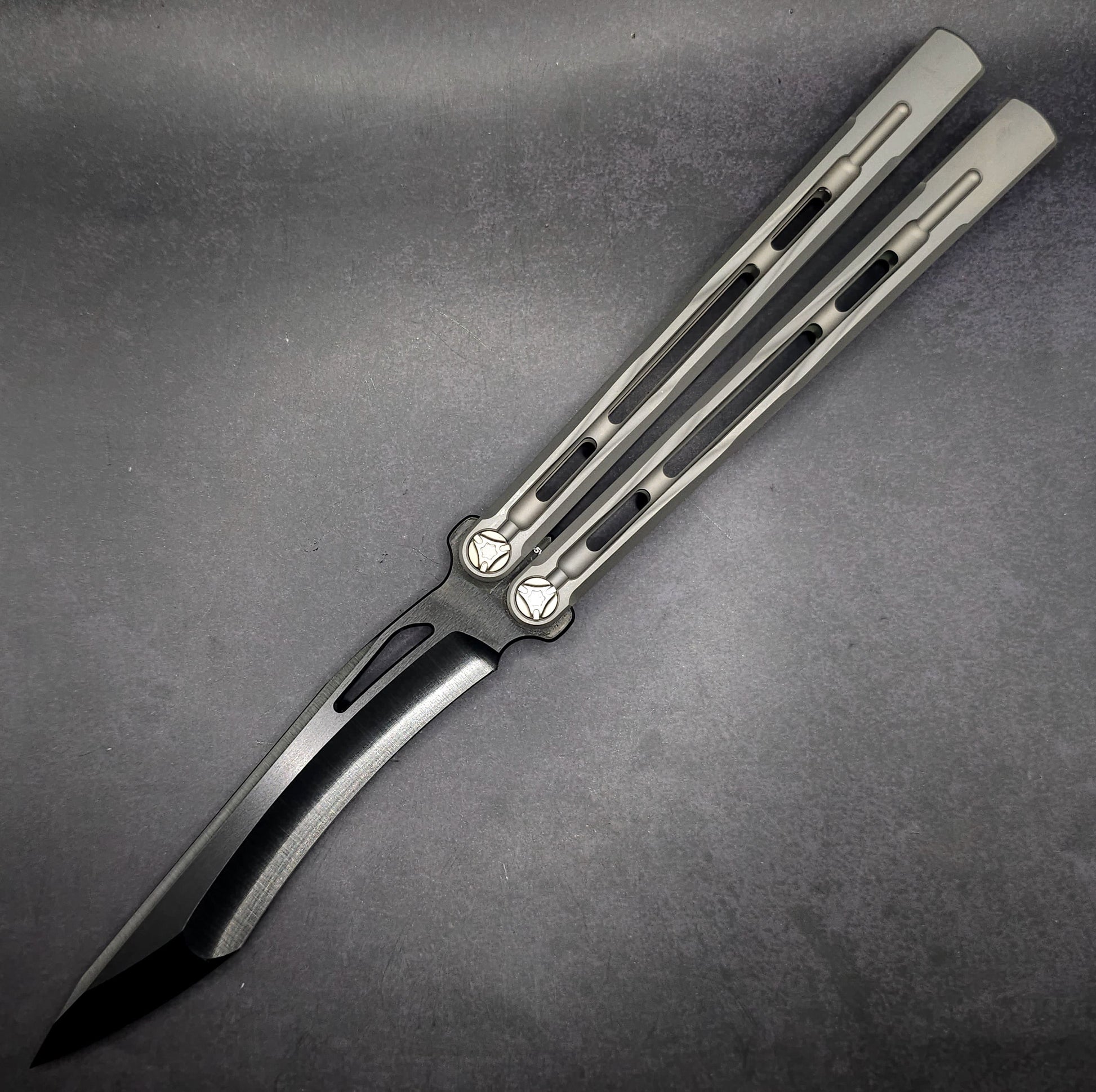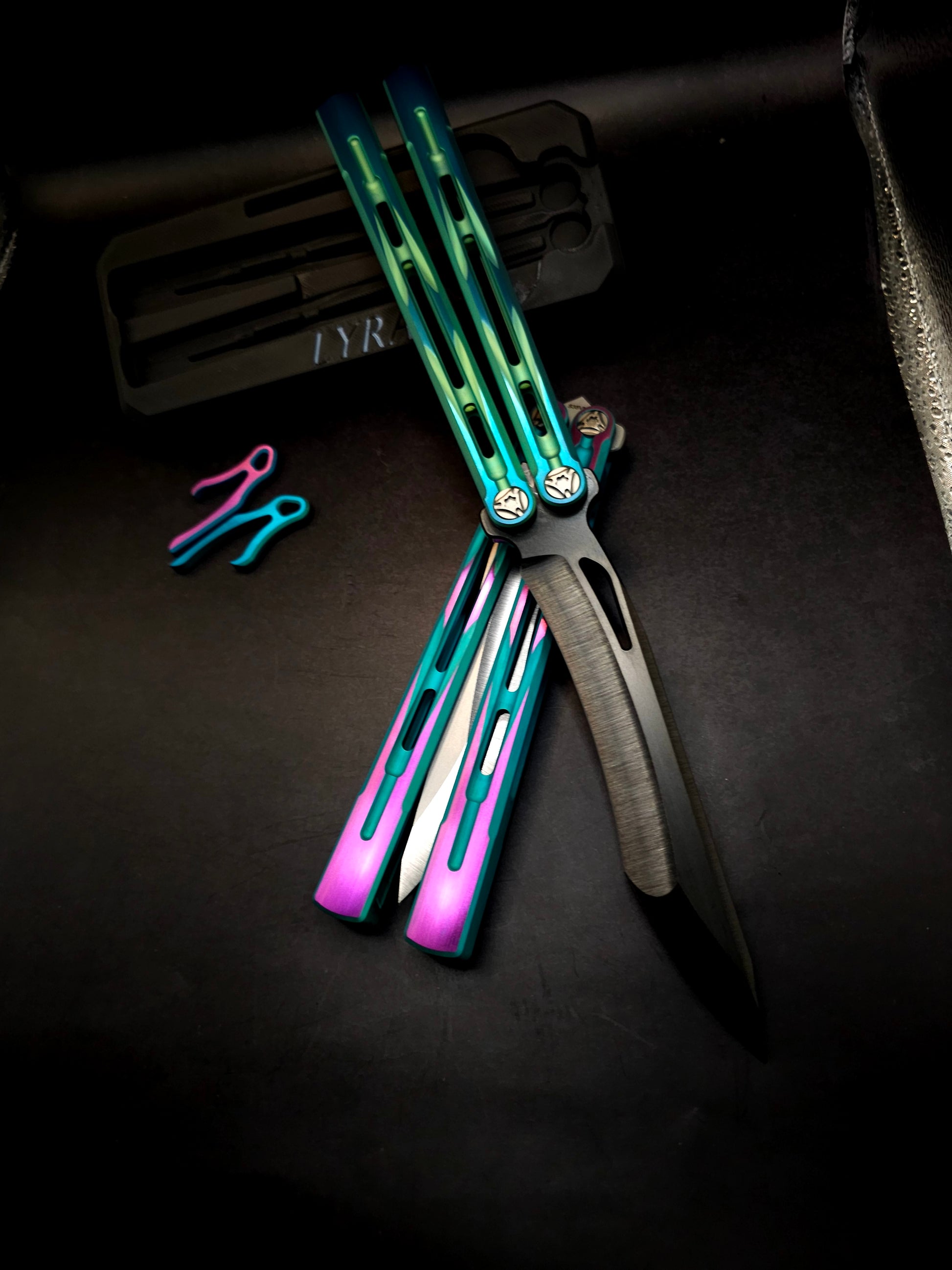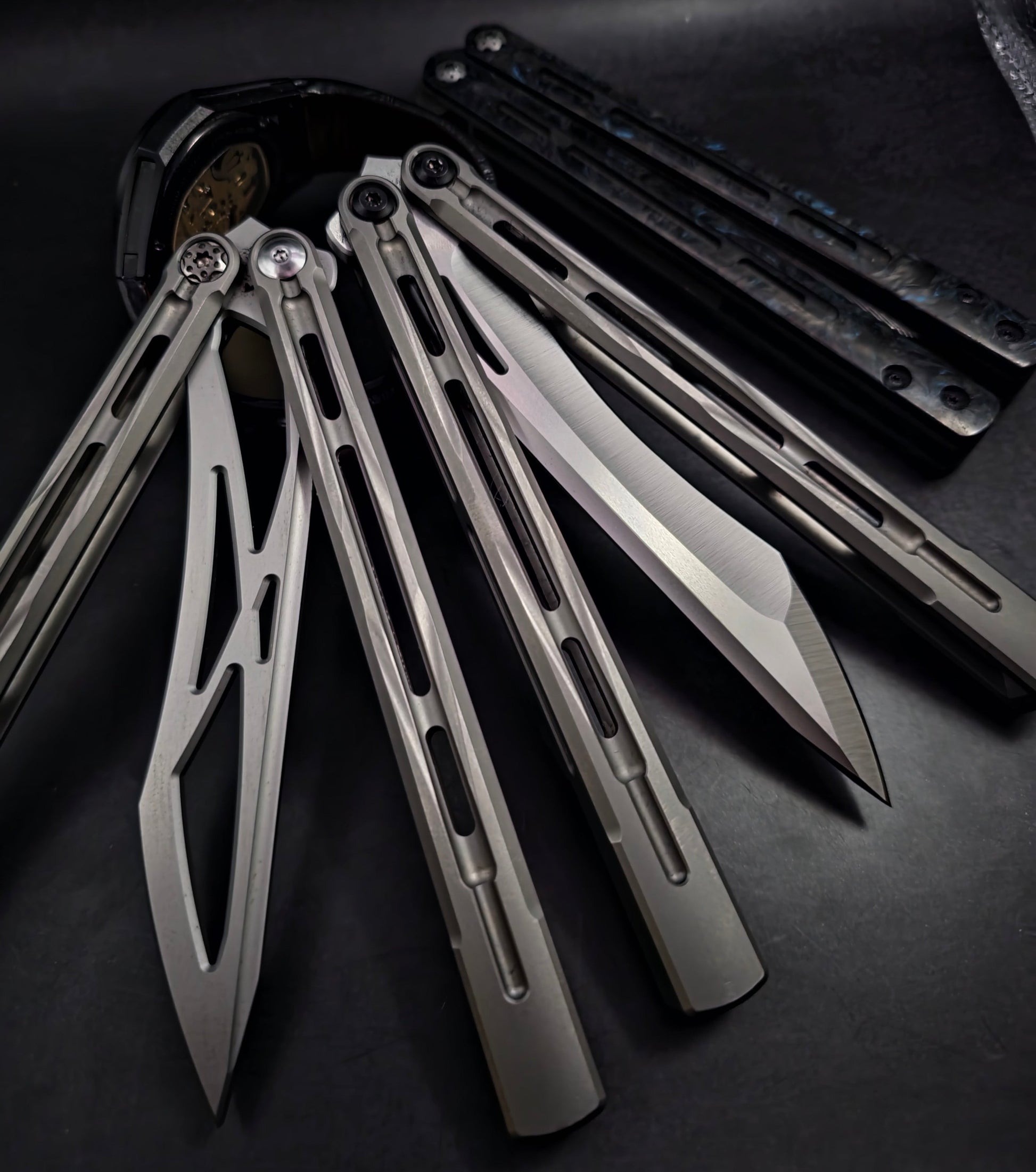 Introducing the Lyra – a precision-engineered balisong crafted from solid titanium billets with a channel construction. This design ensures top-tier flipping dynamics, enhanced durability, and a distinct aesthetic appeal.